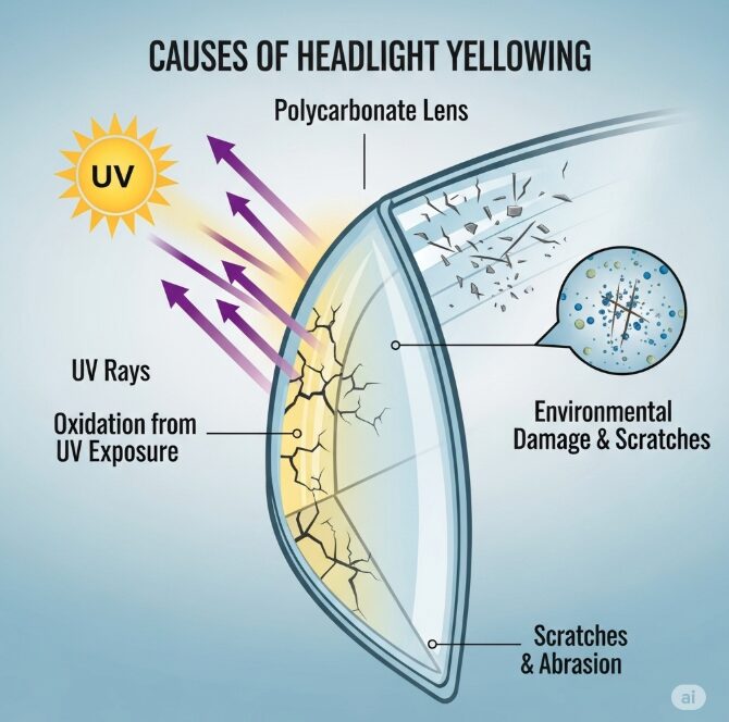 ヘッドライトの黄ばみは、単なる表面の汚れではありません。