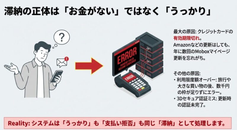 モボックスで滞納が発生してしまうケースのほとんどは、実は「お金がなくて払えない」という意図的なものではなく、ユーザー自身も気づかない「うっかり」によるシステム的な決済エラーなんです。