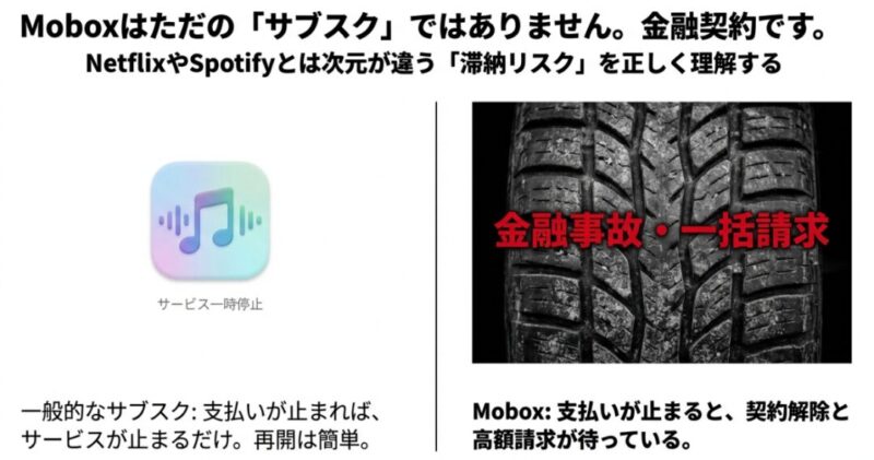 実は、モボックスの滞納リスクは、NetflixやSpotifyのような一般的なサブスクリプションサービスとは次元が違います。