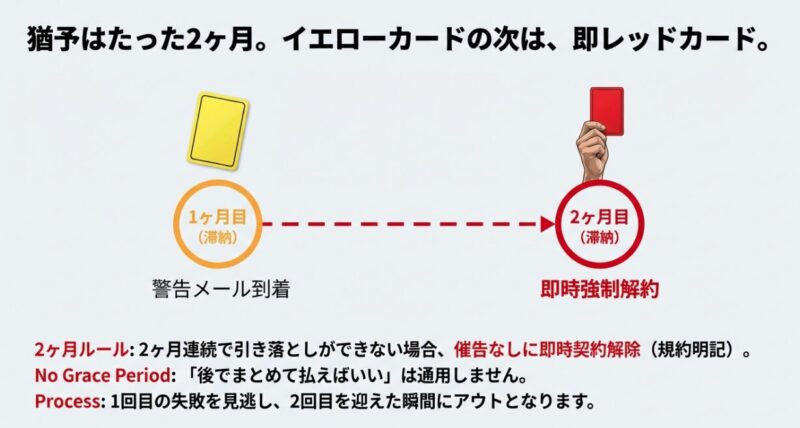 • 2ヶ月が絶対的なデッドライン:2ヶ月連続で引き落としができないと、強制解約と一括請求のリスクが最大化します。猶予はありません。